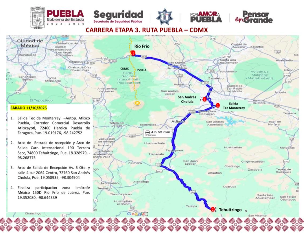 Cabe destacar que los participantes de la Carrera Panamericana ingresarán a Puebla provenientes de Oaxaca con destino a Tehuacán, donde harán una parada para convivir con la afición. Posteriormente, continuarán su trayecto hacia la capital del estado, para llegar a la meta en el Zócalo de Puebla. Durante su recorrido el sábado 11 de octubre, la ruta abarca la región de la mixteca poblana, con una escala en San Pedro Cholula, antes de partir rumbo a la Ciudad de México.