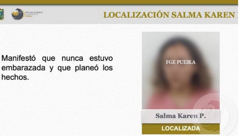 Salma Karen no estaba embarazada y planeó su desaparición para huir del supuesto maltrato físico y sicológico del que era víctima por parte de su pareja sentimental; la Fiscalía General del Estado de Puebla (FGE) continúa con diversas investigaciones para fincar y deslindar responsabilidades contra quienes y los delitos que resulten, incluyendo a la misma joven de 28 años de edad.