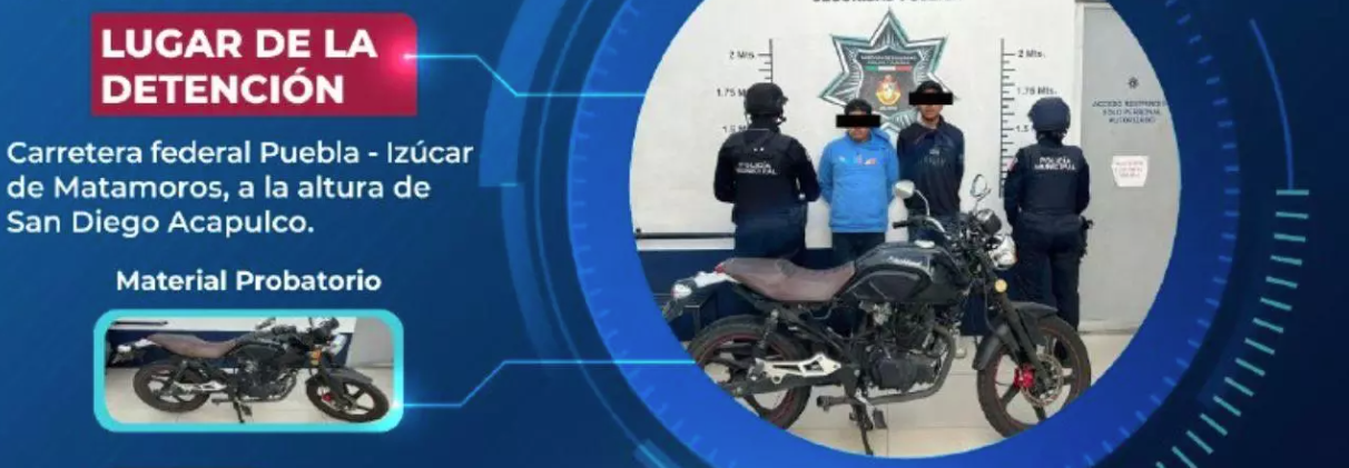 A través de un comunicado, la Dirección de Seguridad Pública Municipal de Atlixco dio a conocer que, en un primer hecho, los agentes detuvieron a dos masculinos, quienes transitaban sobre la carretera Federal Puebla – Izúcar de Matamoros a la altura de San Diego Acapulco, a bordo de una motocicleta que había sido reportada como robada unas horas antes. Por el mismo delito, se detuvo a otro sujeto. Todos ellos fueron puestos a disposición del MP.