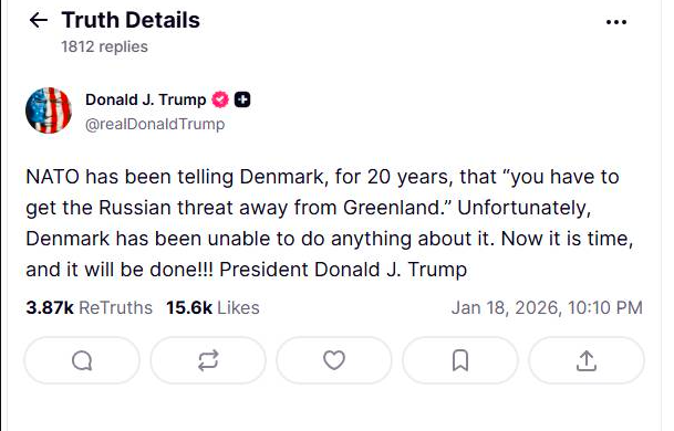 En su mensaje, Trump escribió que “la OTAN lleva 20 años diciéndole a Dinamarca que ‘tienes que alejar la amenaza rusa de Groenlandia’”, pero que el país europeo **no ha podido hacer nada al respecto”, por lo que planteó que ahora es el momento de tomar acción.