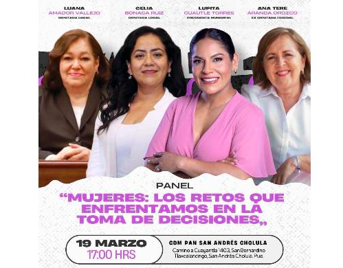 La presidenta municipal de San Andrés Cholula, Guadalupe Cuautle Torres estará participando en el panel “Mujeres: Los retos que enfrentamos en la toma de decisiones”, evento organizado por el comité municipal del Partido Acción Nacional en este municipio.